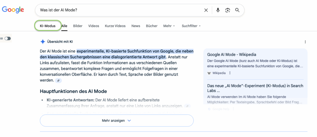 | Integration in die Suche | Die AI Overviews erscheinen automatisch direkt über den organischen Treffern. | Der AI Mode hingegen ist ein separater Modus, in den Nutzer aktuell noch manuell wechseln müssen. |