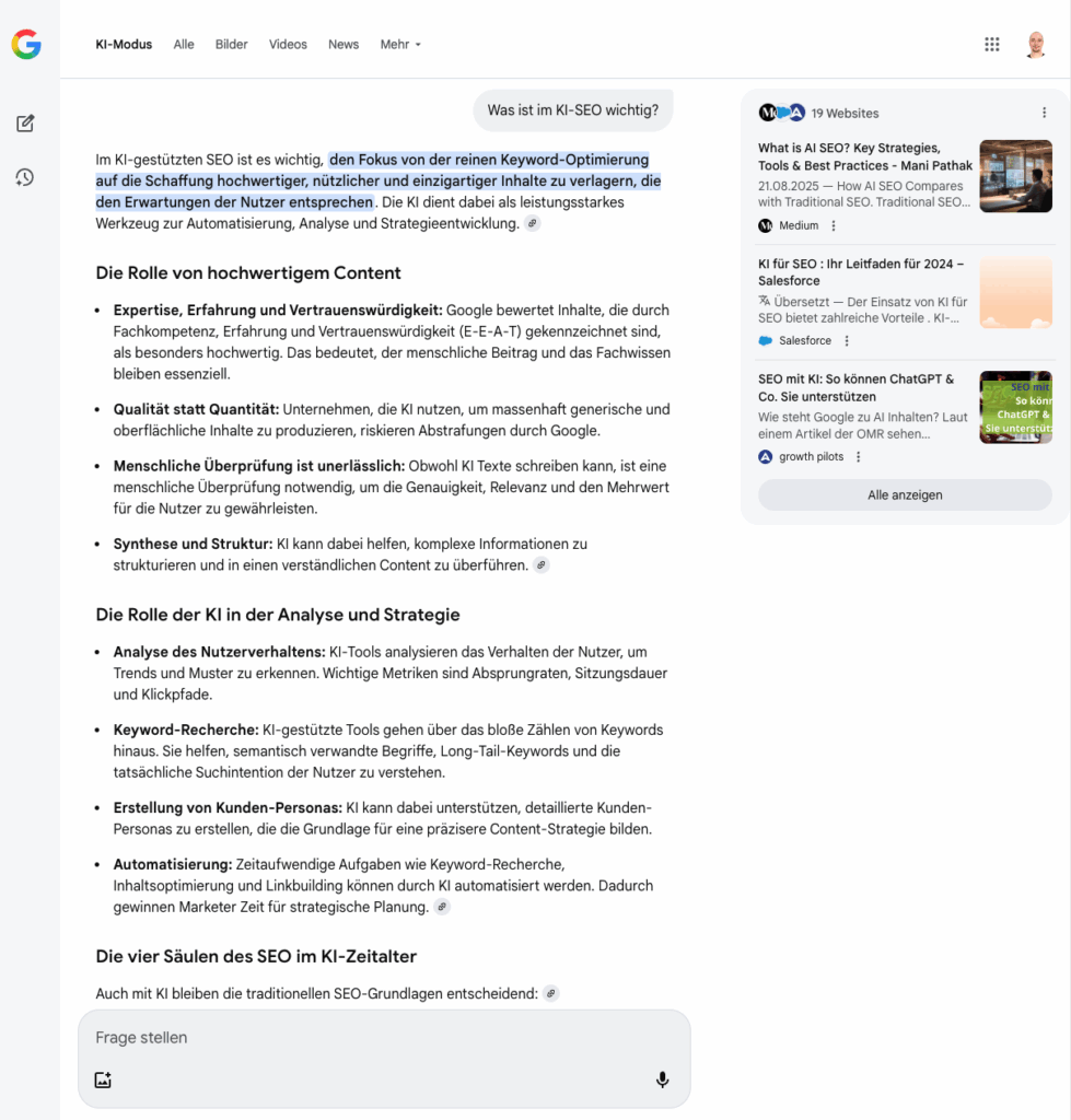 Im AI Mode zählt Präzision. Die KI bevorzugt Inhalte, die konkrete Fragen direkt beantworten, statt Themen zu allgemein oder zu breit zu behandeln.