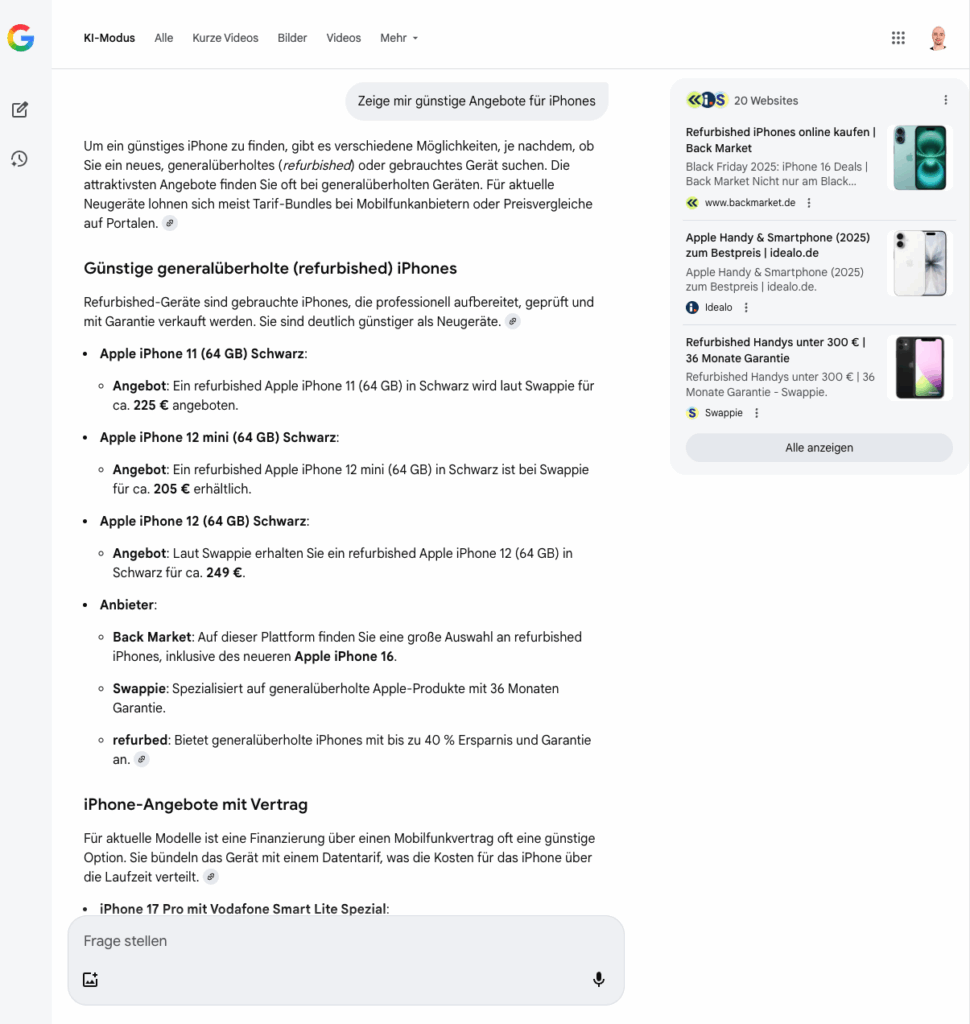 | Folgefragen | In den AI Overviews sind Folgefragen eingeschränkt möglich. | Der AI Mode ermöglicht einen komplexen Dialog mit weiterführenden Fragen. |