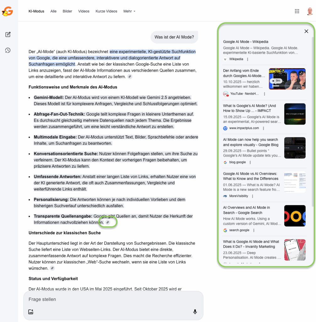 Im AI Mode werden Quellen mittels klassischer Inline-Links in Form eines Link-Symbols am Ende einzelner Absätze genannt. Per Klick auf das Element wird eine Quellenaufstellung neben oder unter der Antwort – je nach Endgerät – abgerufen. Laut einer Analyse von Sistrix enthalten die Antworten des AI Mode im Durchschnitt rund 15 Quellenangaben pro Ergebnis.