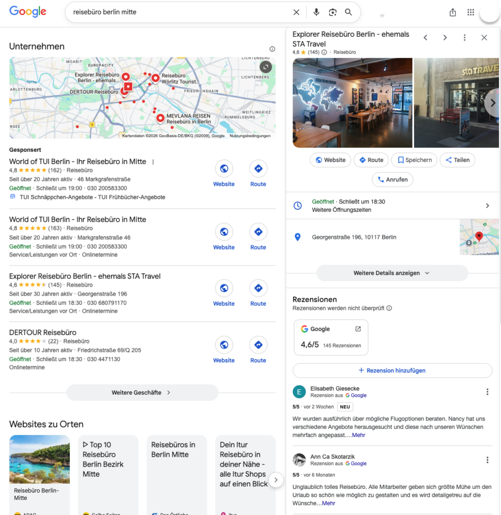 Neben dem Unternehmensprofil spielen lokale Keywords eine wichtige Rolle. Sie verbinden das Angebot oder die Frage mit einem konkreten Ort, einer Region oder einem Abfahrtsstandort – zum Beispiel “reisebüro in berlin-mitte”. Diese platzierst Du wie üblich unter anderem in diesen Positionen: