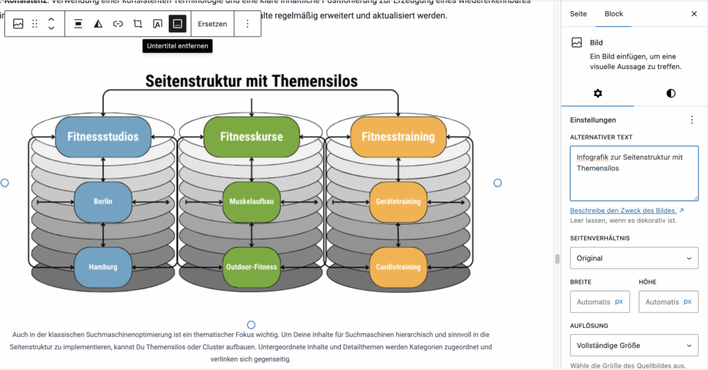 - ALT-Attribut: Der Alt-Text wird ausgelesen, wenn ein Bild nicht angezeigt werden kann. Trage hier eine kurze Bildbeschreibung (ca. 5 bis 7 Wörter) mit dem wichtigsten Keyword ein.