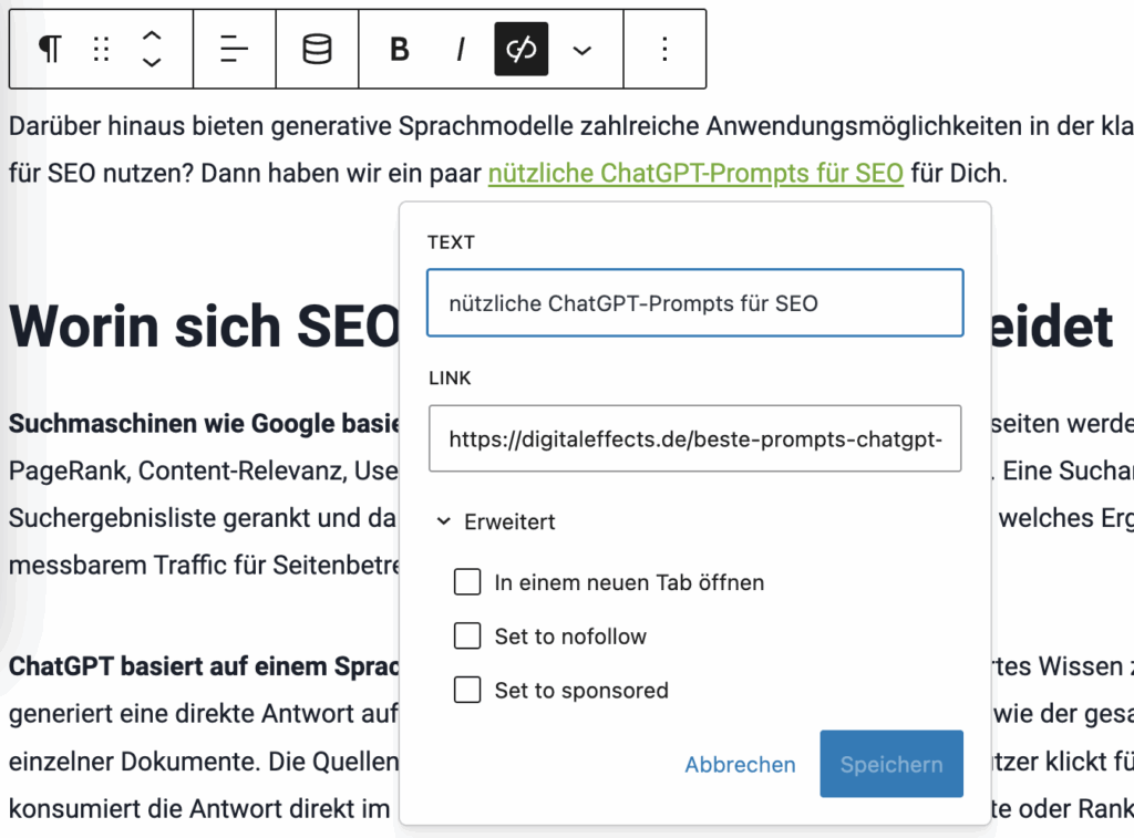 - Bei Bedarf kannst Du nun die Attribute des Links festlegen. So kannst Du die Zielseite in einem neuen Tab öffnen lassen, eine Markierung von gesponserten Werbelinks vornehmen oder per „nofollow” Suchmaschinen-Crawler davon abhalten, dass diese dem Link folgen, wenn diese die Zielseite nicht sehen sollen.