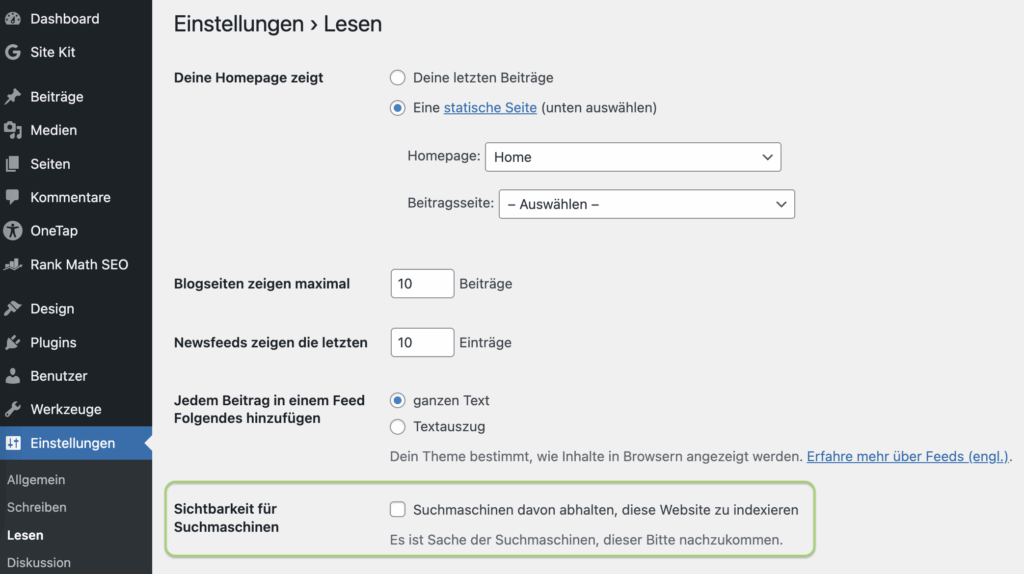 Damit Suchmaschinen wie Google Deine WordPress-Seite crawlen und in den Suchergebnissen anzeigen können, musst Du Ihnen den Zugriff und die Indexierung erlauben. In den Einstellungen unter „Lesen“ findest Du dafür die Schaltfläche „Sichtbarkeit für Suchmaschinen“. Ist hier ein Häkchen gesetzt, blockierst Du die Indexierung der gesamten Webseite über den Robots-Meta-Tag – Google wird Deine Inhalte dann nicht in den Suchergebnissen anzeigen.